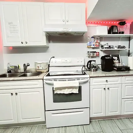 Een ingerichte keuken met een waterkoker, een koelkast en een oven is beschikbaar als onderdeel van de zelfvoorzienende voorzieningen van dit appartement.